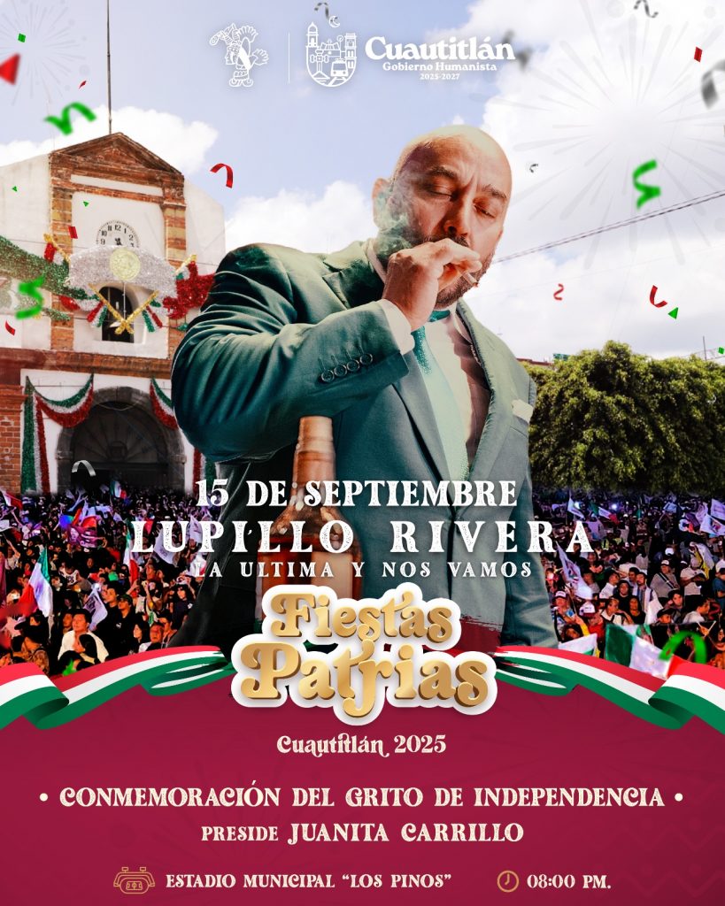 El Gobierno de Cuautitlán, encabezado por la presidenta municipal Juanita Carrillo, invita a todas las familias cuautitlenses a participar en las celebraciones conmemorativas del Grito de Independencia, este 15 de septiembre, en el Estadio Municipal “Los Pinos”.