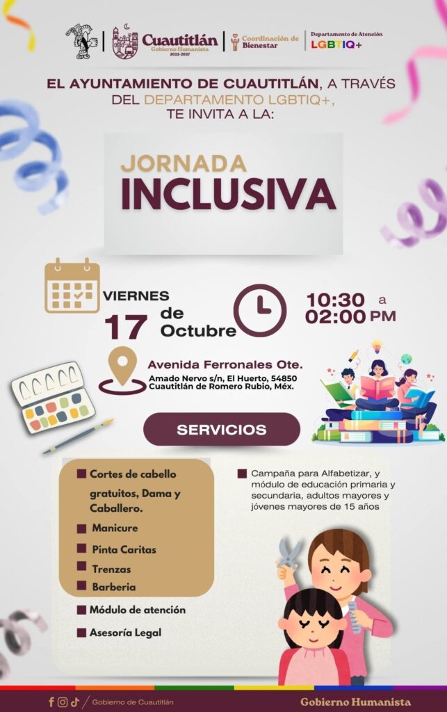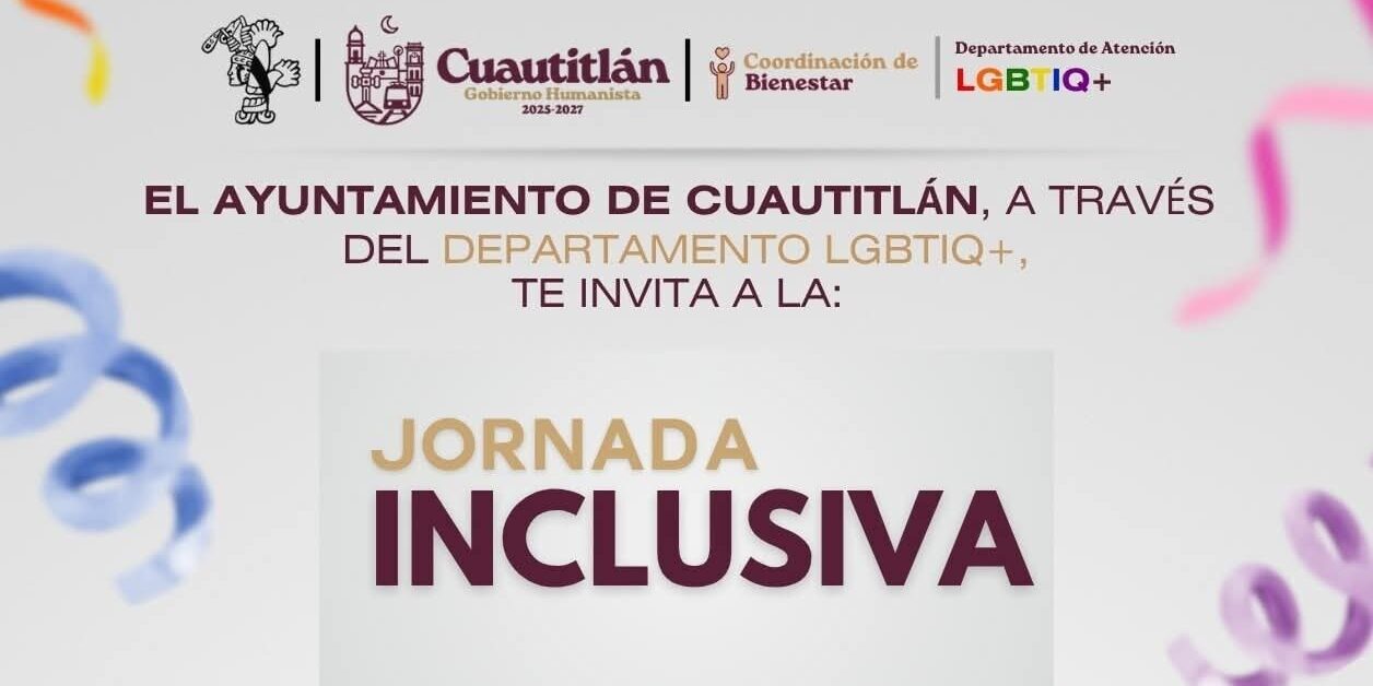 El Gobierno de Cuautitlán, encabezado por la presidenta municipal Juanita Carrillo, a través del Departamento de Atención LGBTIQ+ y la Coordinación de Bienestar, invita a la ciudadanía a participar en la Jornada Inclusiva, que se llevará a cabo este viernes 17 de octubre en la Avenida Ferronales Oriente, colonia El Huerto, a partir de las 10:30 de la mañana y hasta las 2:00 de la tarde.