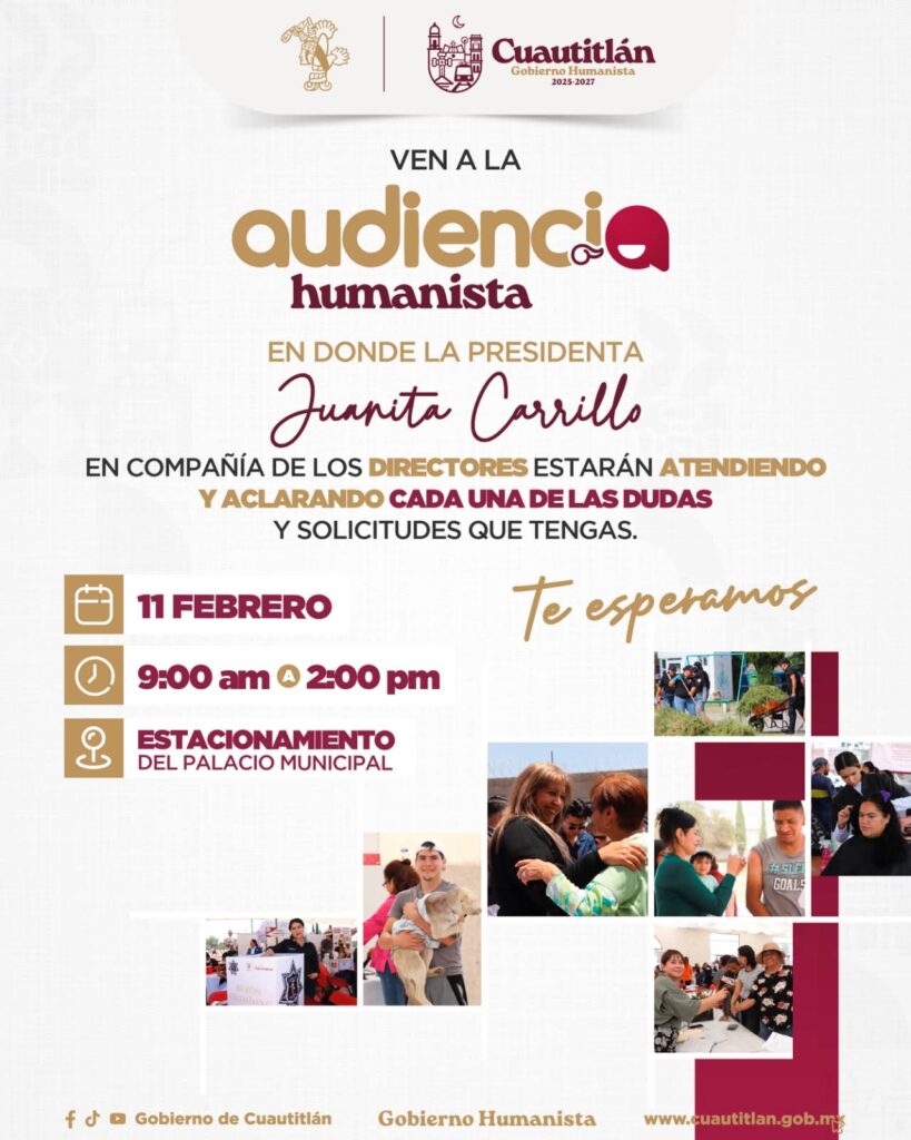 Como parte de una política de puertas abiertas y cercanía con la ciudadanía, el Gobierno Municipal de Cuautitlán invita a la población a participar en la Audiencia Humanista “Día del pueblo”un espacio de diálogo directo encabezado por la presidenta municipal Juanita Carrillo, acompañada por las y los directores de las distintas áreas del Ayuntamiento.
