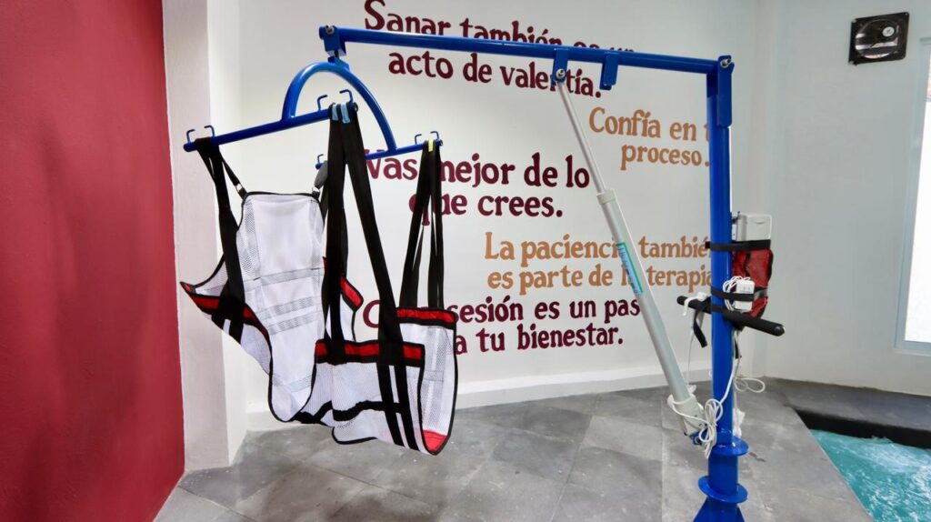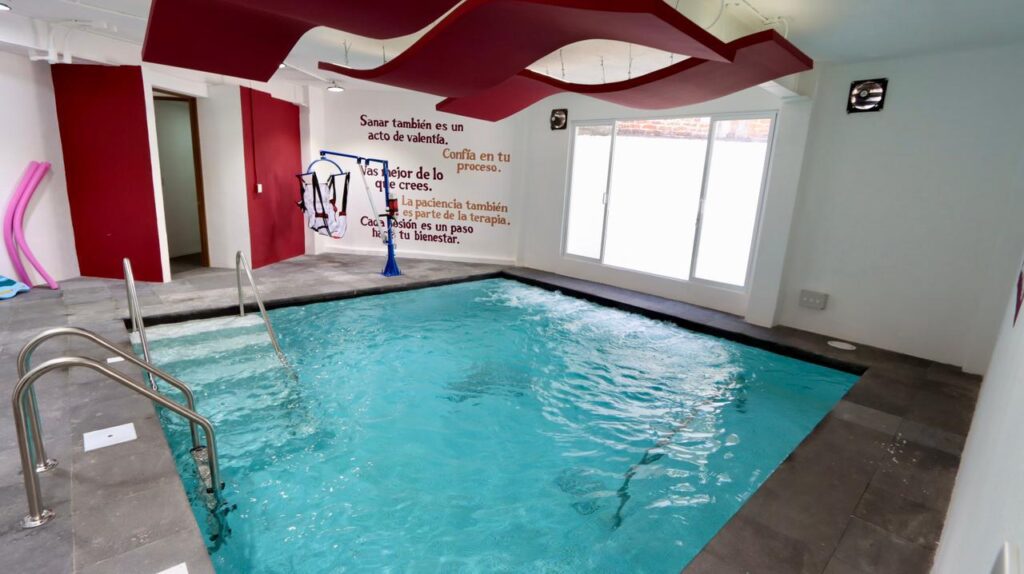 Cuenta con: Sistema moderno de auto lavado y auto filtrado, Bomba de calor que mantiene el agua a 35 grados de temperatura, Grúa con capacidad de hasta 115 kilogramos para el traslado seguro de pacientes, Escalera marina para facilitar el acceso. Capacidad de atención simultánea para 15 pacientes, Dos áreas de baño completas para damas y caballeros, con regaderas y sanitarios, Espacios diseñados bajo medidas que garantizan movilidad y accesibilidad.