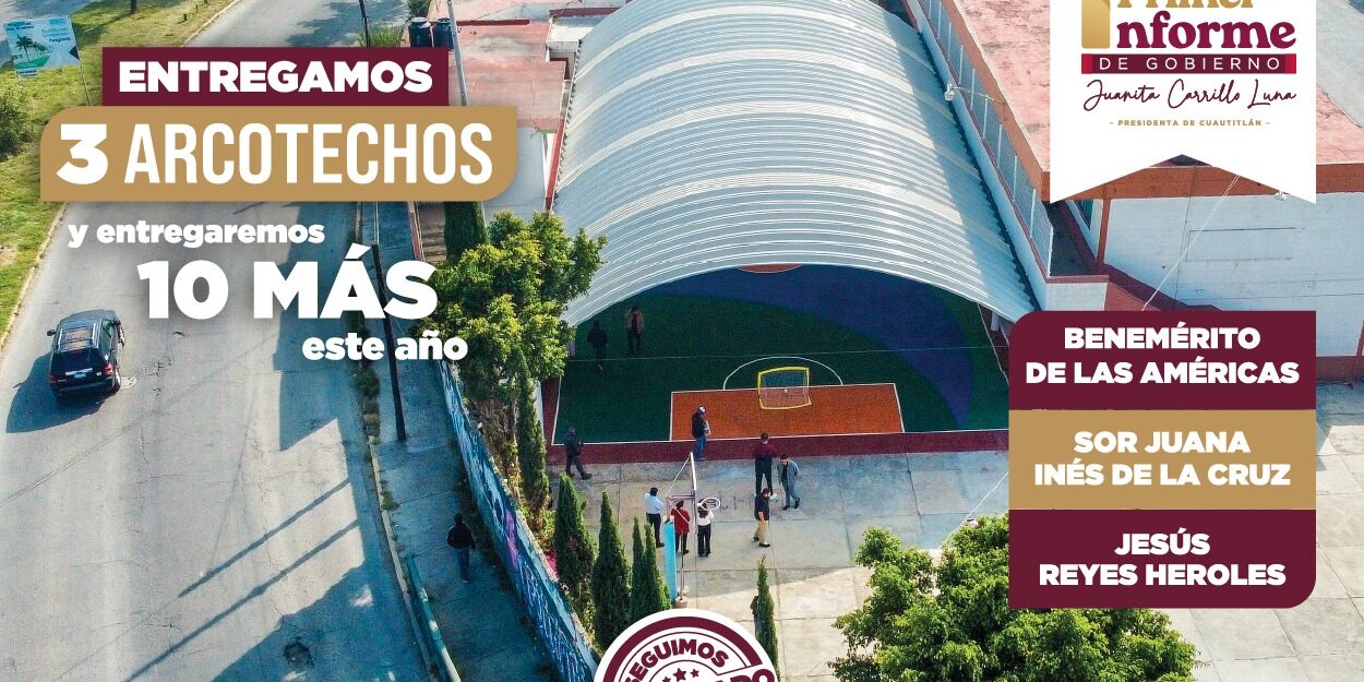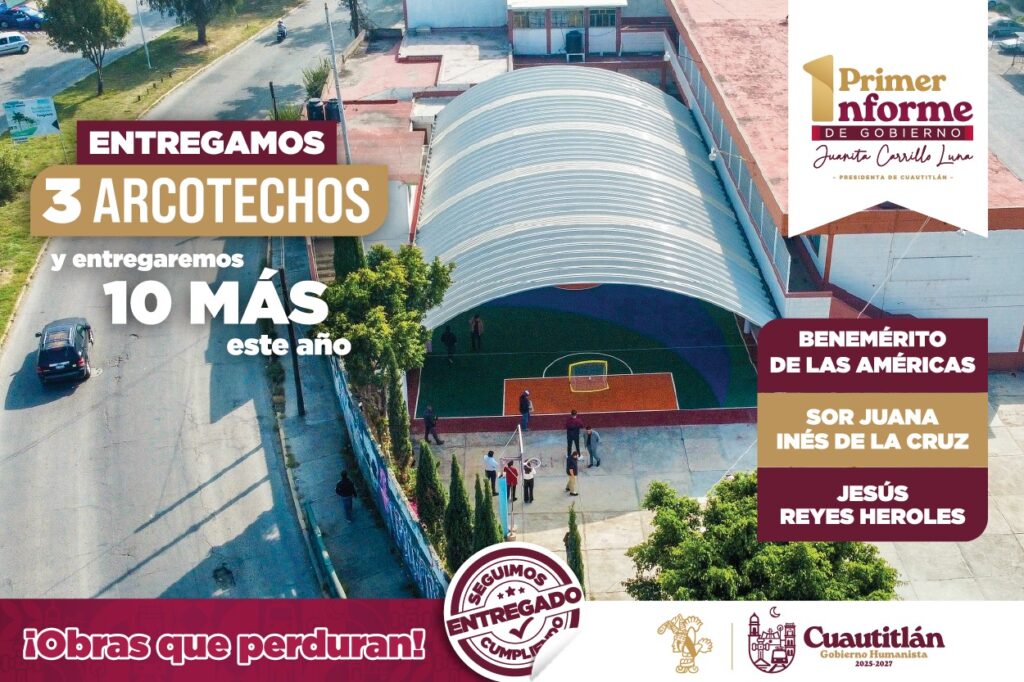 La presidenta municipal informó que este año se entregaron tres arcotechos y una plaza cívica, y se construyen once más.
