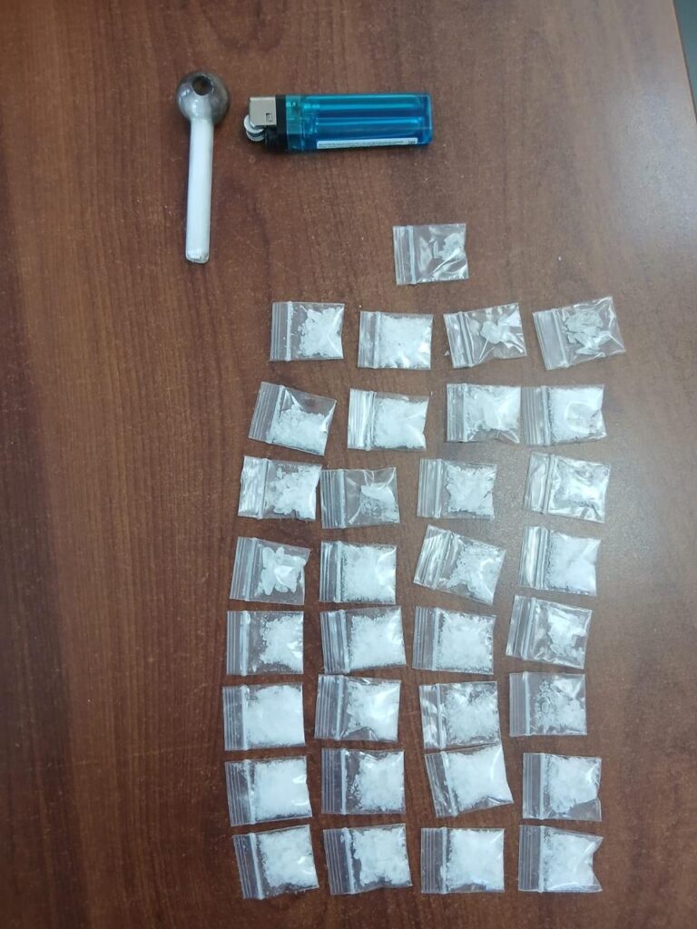 Al realizar una inspección preventiva, se localizaron entre sus pertenencias 33 envoltorios tipo ziploc que contenían una sustancia con características propias de la metanfetamina (cristal), así como una pipa de vidrio y un encendedor.