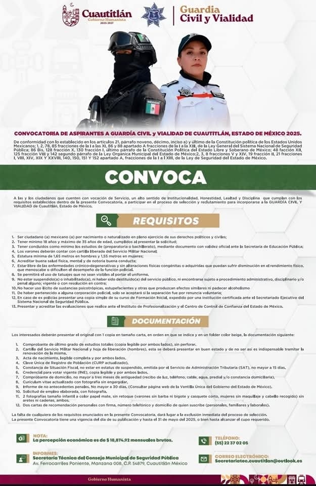 Para más información, las y los aspirantes pueden acudir a la Secretaría Técnica del Consejo Municipal de Seguridad Pública, ubicada en Av. Ferrocarriles Poniente, Manzana 008, C.P. 54879, Cuautitlán, Estado de México, o comunicarse al teléfono (55) 22-37-02-05 y al correo electrónico secretariatec.cuautitlan@outlook.es. Asi como también podrán descargar la convocatoria completa, a través del siguiente link https://shorturl.at/Orj4v