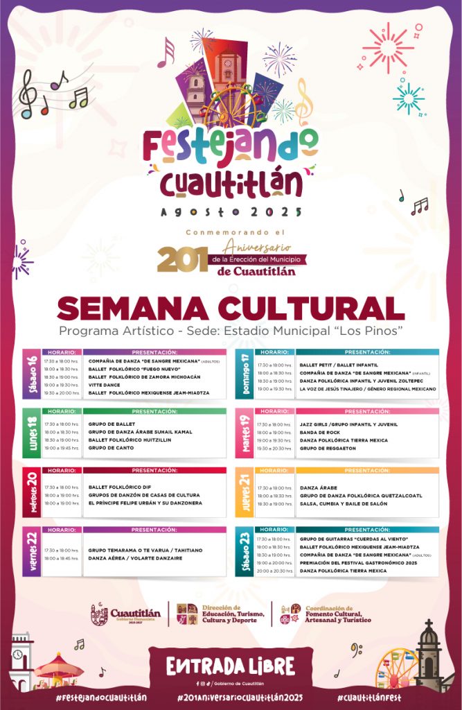El Gobierno Municipal de Cuautitlán, a través de la Dirección de Cultura y en coordinación con el Sistema Municipal DIF, invita a la población a participar en las actividades conmemorativas del 201 Aniversario de la Fundación de Cuautitlán, que se llevarán a cabo del 16 al 23 de agosto de 2025 en el Estadio Los Pinos, con acceso gratuito para todas y todos los asistentes.