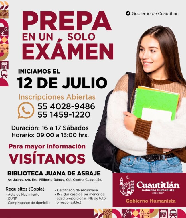 Cuautitlán, Estado de México, 05 julio de 2025 Boletín solo informativo 132  Como parte de su compromiso con la educación y el desarrollo de las y los cuautitlenses, la presidenta municipal Juanita Carrillo anunció el arranque del programa “Prepa en un solo examen”, el cual comenzará el próximo 12 de julio en la Biblioteca Juana…